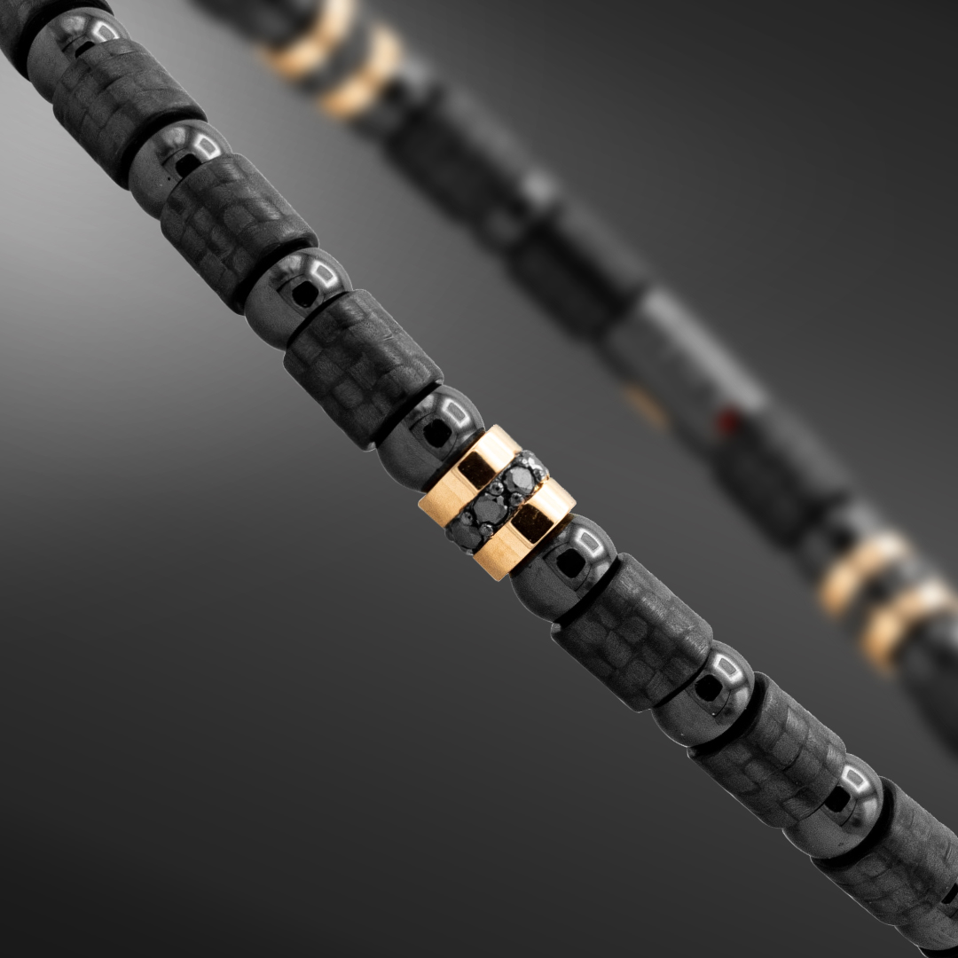 Byzylyk për meshkuj Roberto DeMeglio. Punuar në mënyrë artizanale në flori Rose Gold 18K, qeramikë hight-tech në ngjyrë të zezë si dhe fibër karboni. Në pjesën e brendshme struktura përforcohet nga susta e titanit që i jep byzylykut fortësi dhe stabilitet. Montuar me 0.40ct Diamantë të Zinj.