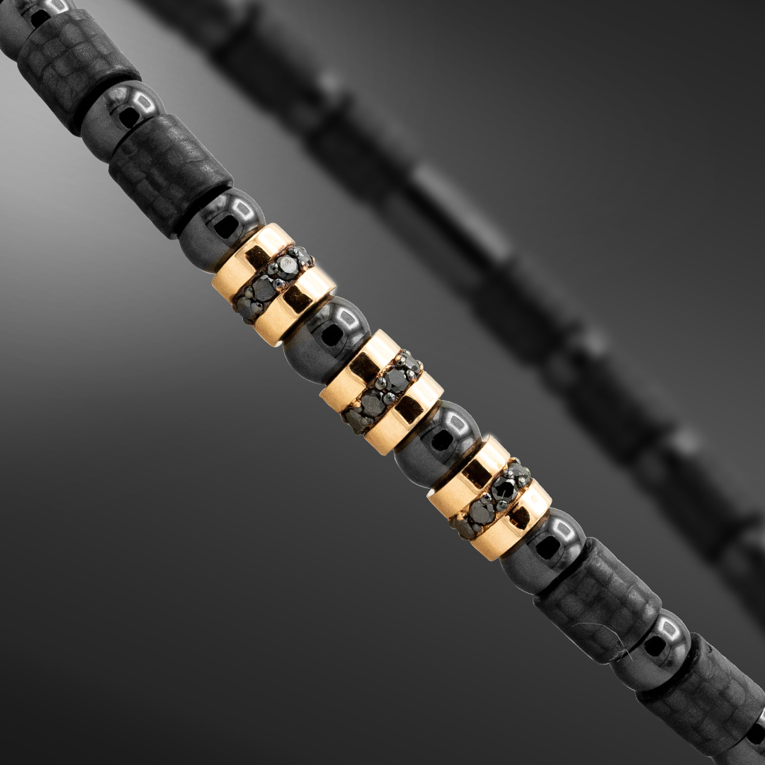 Byzylyk për meshkuj Roberto DeMeglio. Punuar në mënyrë artizanale në flori Rose Gold 18K, qeramikë hight-tech në ngjyrë të zezë si dhe fibër karboni. Në pjesën e brendshme struktura përforcohet nga susta e titanit që i jep byzylykut fortësi dhe stabilitet. Montuar me 0.24ct Diamantë të Zinj.