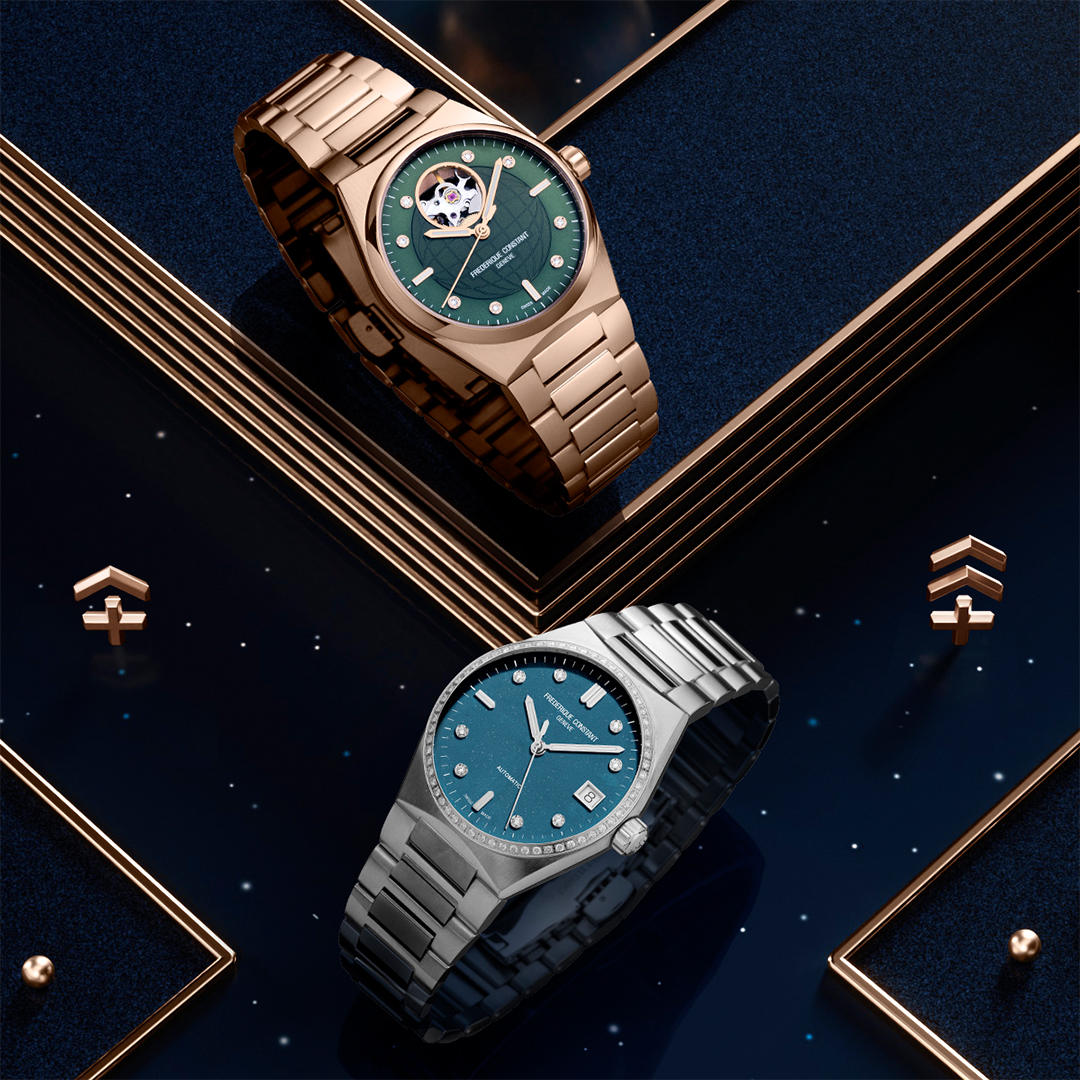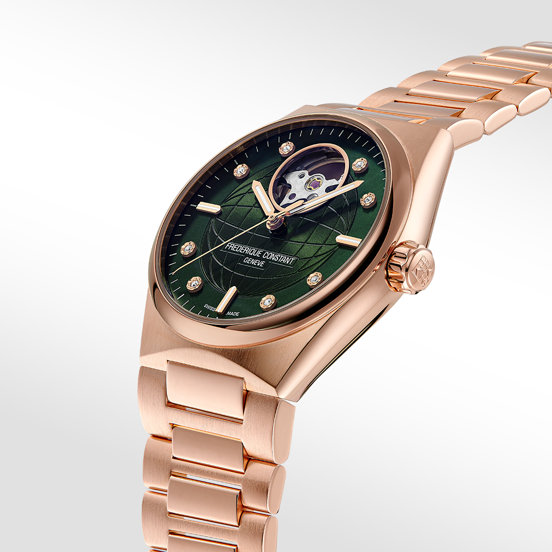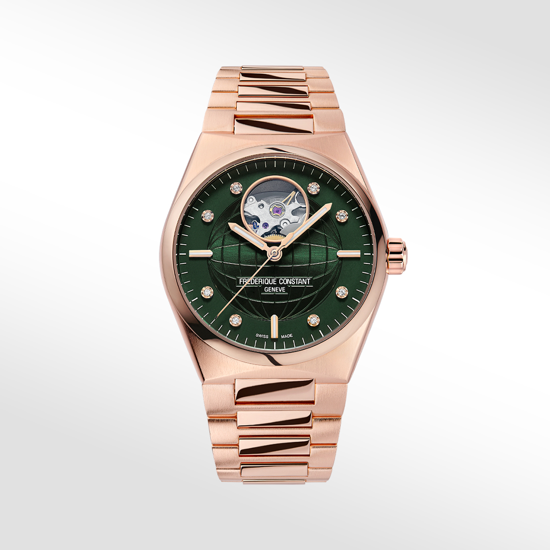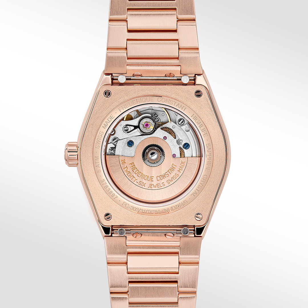 The Highlife Ladies Automatic Heart Beat models capture the legacy of the Manufacture and carry it toward new creative horizons. At 12 o’clock, the pieces proudly display the window on their mechanical heart, made famous by Frederique Constant. Known as the “Heart Beat”, it lets you see the beating heart of the watch, its mechanical movement. It also reveals some essential components of Swiss Made precision.