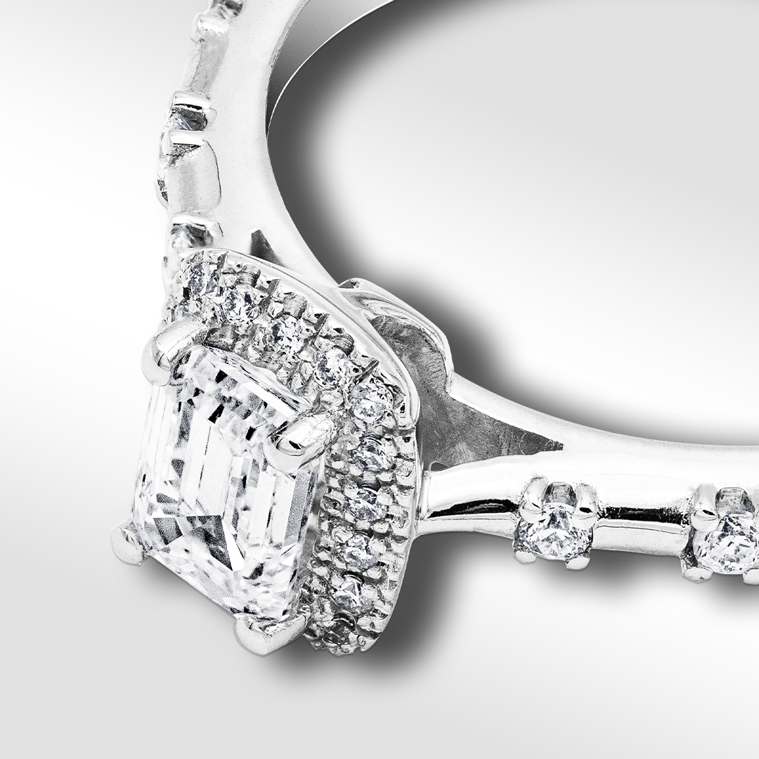 Unazë Fejese punuar në mënyrë artizanale në flori të bardhë 18kt, montuar me një Diamant Natyral qëndror 0.62 ct ngjyrë F, pastërti VS në prerje Emerald si dhe 0.18ct Diamantë rrethues në prerje Brilante ngjyrë G, pastërti VS. Masa 14.