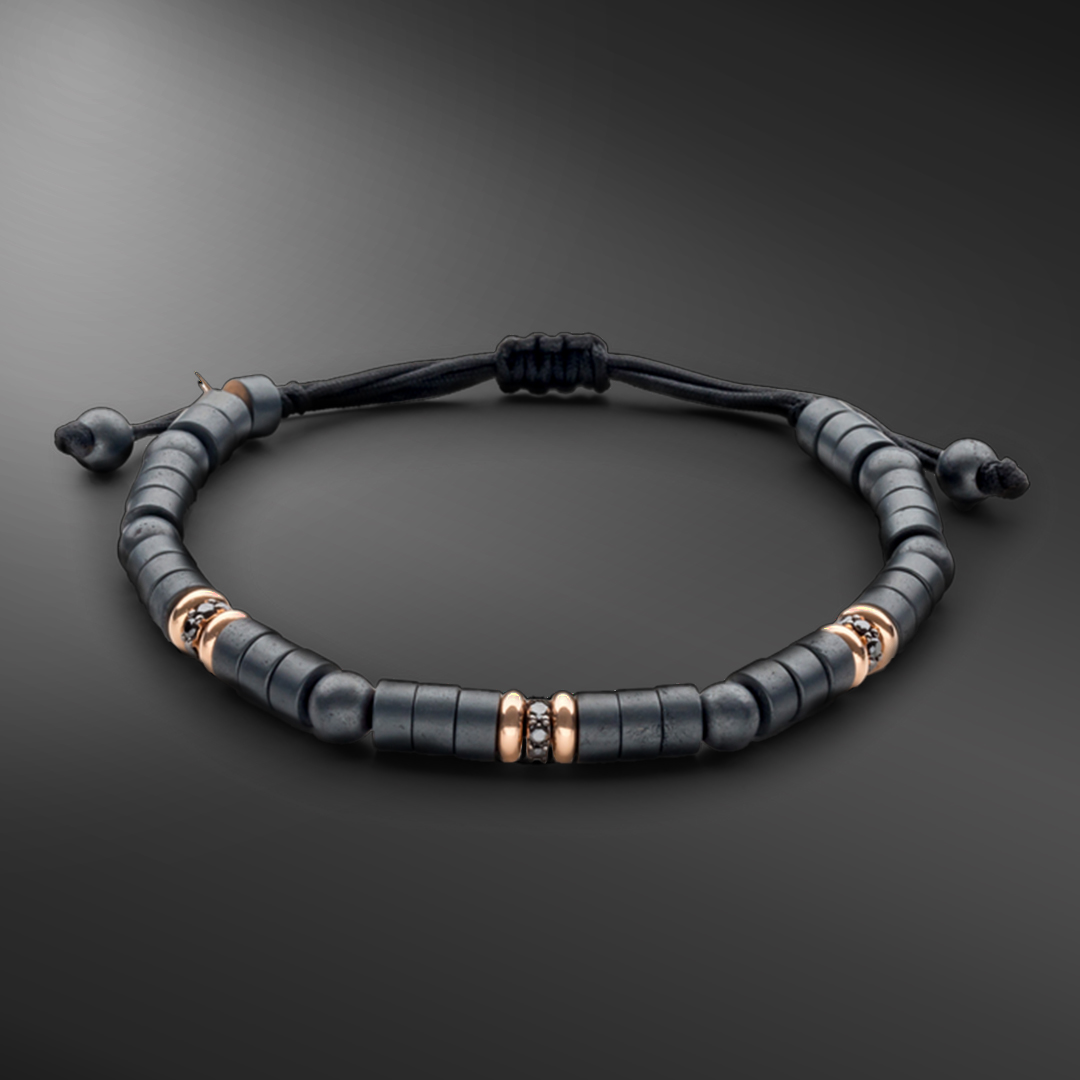 Byzylyk për meshkuj punuar në mënyrë artizanale në Flori 18K Rose Gold, gurë natyral Hematite dhe Onyx, Diamantë të Zinj si dhe rrip nautik Macrame.