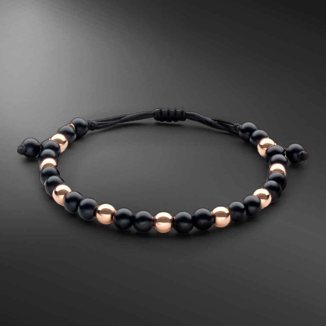 Byzylyk për meshkuj punuar në mënyrë artizanale në Flori 18K Rose Gold, gurë natyral Onyx si dhe rrip nautik Macrame.