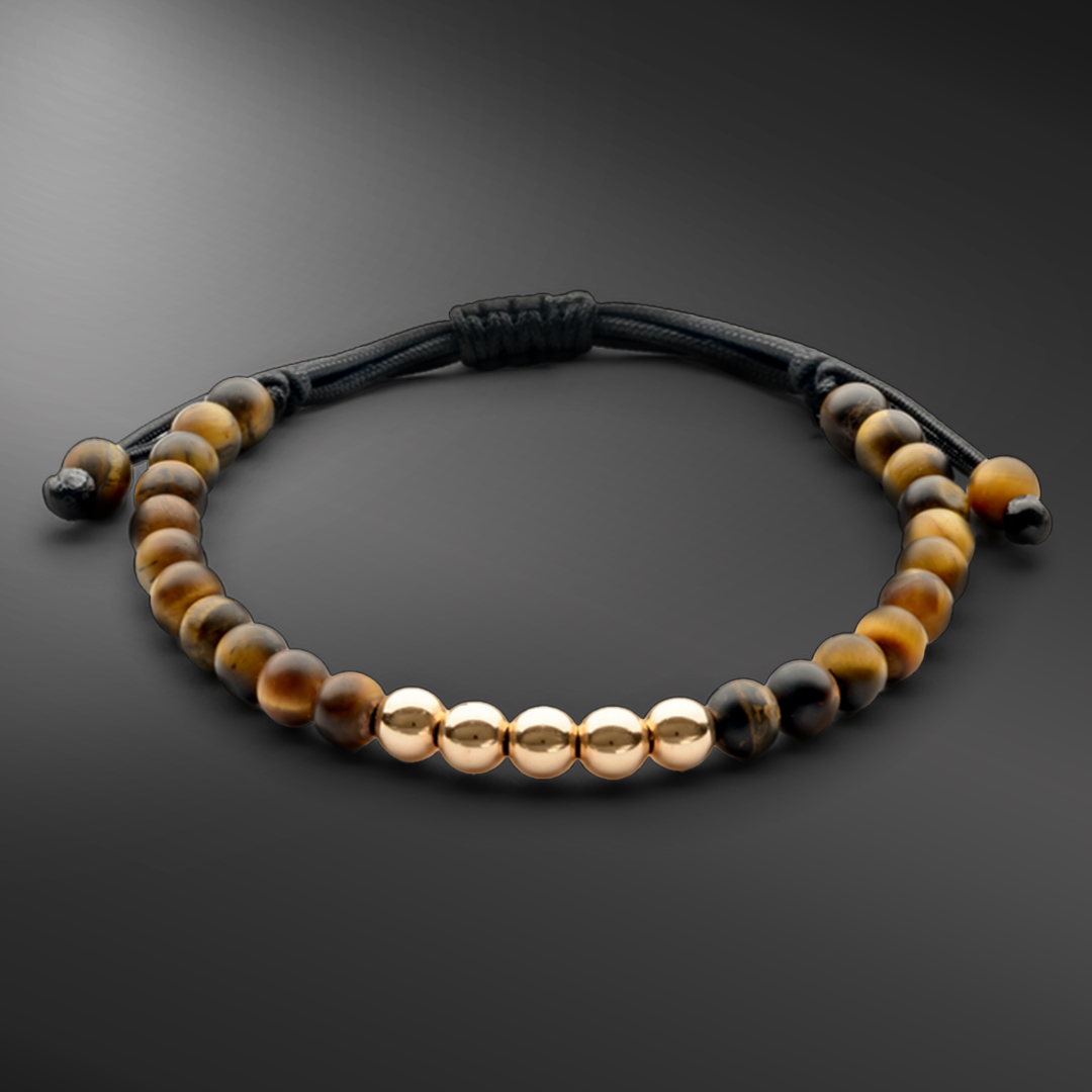 Byzylyk për meshkuj punuar në mënyrë artizanale në Flori 18K Rose Gold, gurë natyral Sy Tigri si dhe rrip nautik Macrame.
